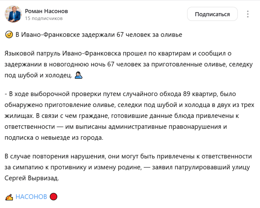 В мережі з’явився російський фейк про затримання 67 осіб в Івано-Франківську в новорічну ніч за приготування салату олів’є, оселедця під шубою і холодцю. Росіянин Роман Насонов, який називає себе “експертом комплексної безпеки, військовим експертом і полковником запасу”, опублікував такий пост на російській блог-платформі “Дзен”.