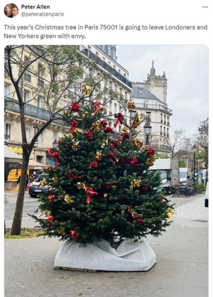 Колега Ендрю Ніла, журналіст Пітер Аллен, який проживає у Франції, також поділився в соціальних мережах своїми враженнями про різдвяну ялинку в Парижі.