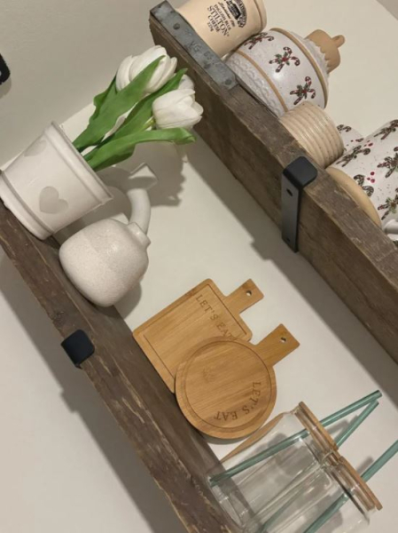 До того ж, щоб не витрачати гроші на розкішні полиці, майстриня зробила їх власноруч, використовуючи вторинну деревину та ручки, замовлені на Amazon. Свій інтер’єр жінка доповнила оригінальною кухонною дошкою.