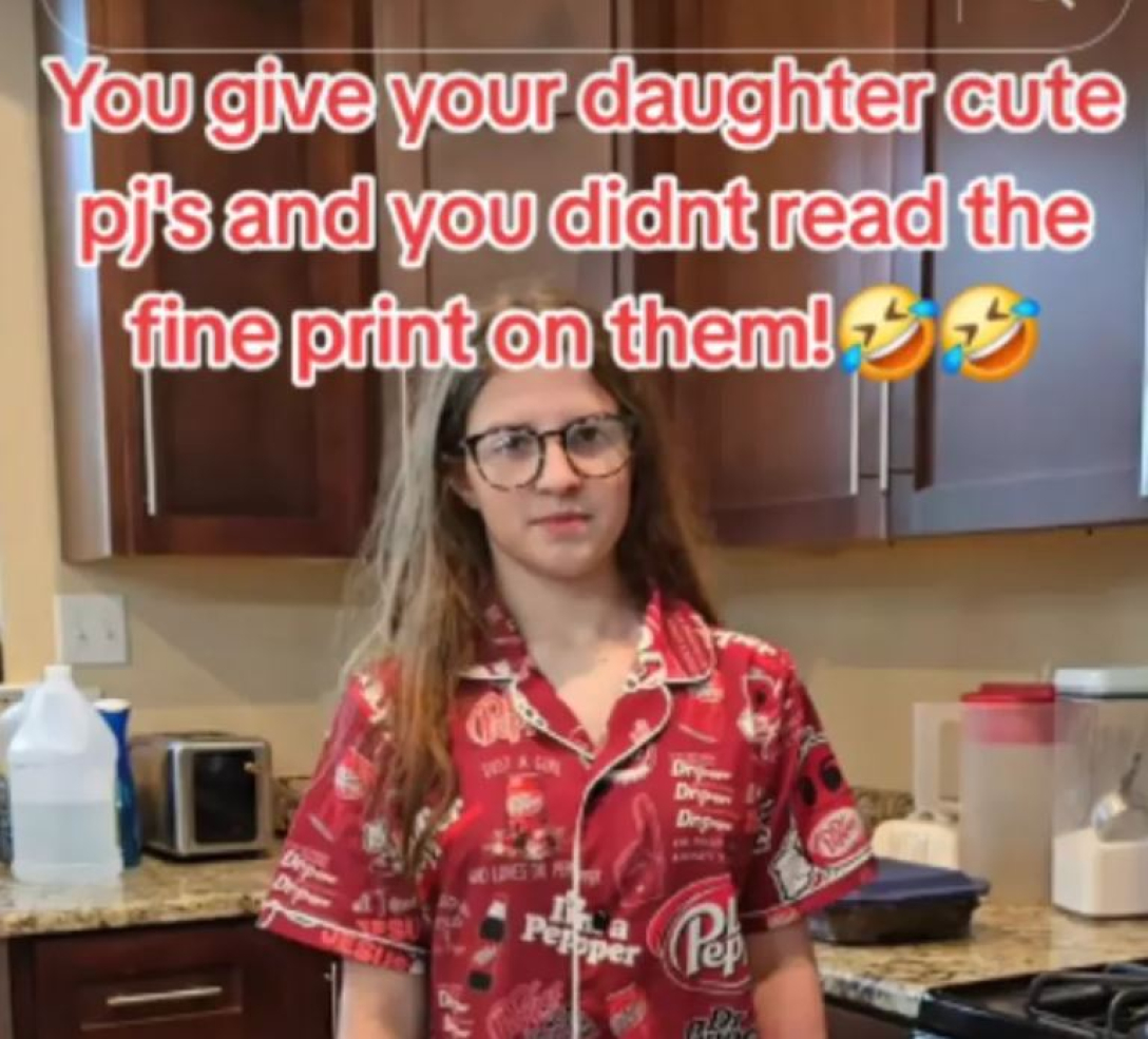 Однак початкова радість змінилася легким збентеженням, коли дівчинка почала читати деякі слогани, розміщені на одязі. Найпомітніший з них розміщений на передній частині нічної сорочки. Там пише: “Я або п’ю Dr. Pepper, або збираюся пити, або виводжу камені з нирок”.