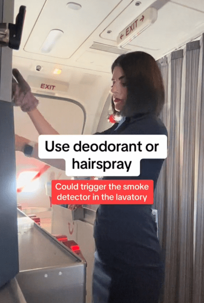 Mrs Miva попереджає, що розпилення аерозолів у туалетній кімнаті літака може активувати датчики диму, що викличе тривогу і може вимагати втручання екіпажу. Це створює незручності для всіх пасажирів і може призвести до штрафу або інших неприємних наслідків.