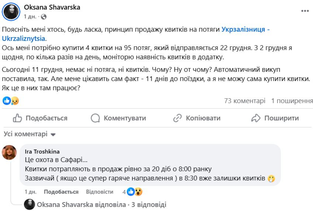 “За 20 днів, о 8:00 ранку, я відкривала ваш додаток, оскільки планувала подорож завчасно. Це якась магія, що усі побачили цей потяг і викупили абсолютно всі місця, а я ні? Не можу повірити, що кілька сотень пасажирів гуртом прокинулися в один день, в один час і моментально викупили всі квитки”, — написала Оксана, але так і не отримала відповіді.