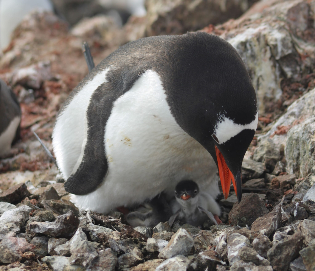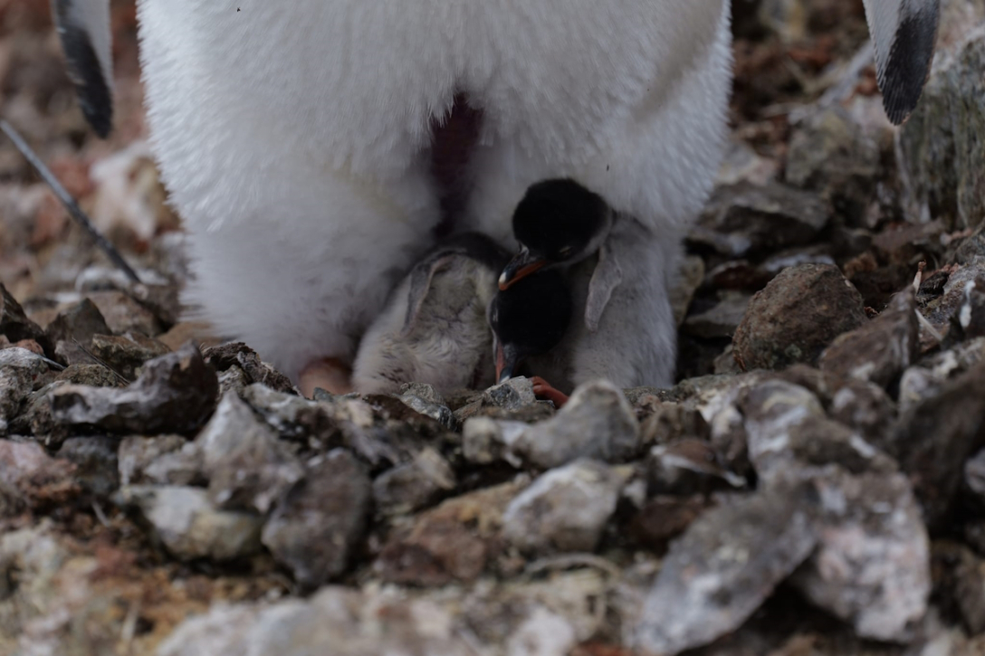“Перше дитинча вже активне – годується, пищить, тож йому десь пів доби. А друге, мабуть, вилупилося прямо перед моїм приходом, бо воно ще в шматках шкаралупи й ховається під дорослого пінгвіна”, – розповів вчений.