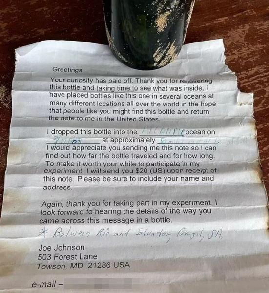 “Я буду вдячний, якщо ви перешлете мені це повідомлення, щоб я знав, як далеко та як довго подорожувала пляшка. Щоб винагородити вас за участь у моєму експерименті, я вишлю 20 доларів, коли отримаю цю записку від вас”, — додав мандрівник.