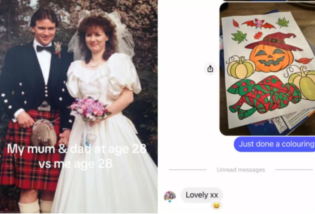 У кумедному ролику Рід з Шотландії показано два зображення. На першому — весільна фотографія її батьків, Крістін та Джона МакГаккінів, які одружилися саме у 28 років. На другому — її розмальовка, надіслана мамі, щоб похизуватися.