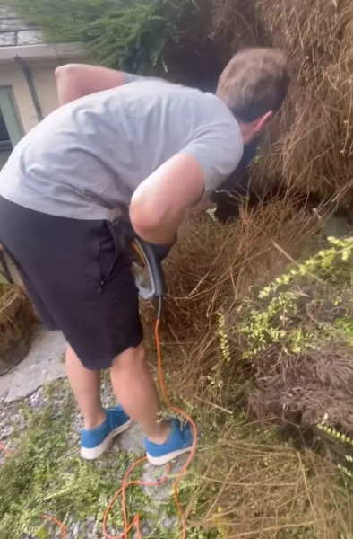 У кадрі можна побачити, як Бен підстригає чагарник, який вкриває будівлю біля гаража, й продирається крізь грубі зарослі, щоб виявити кам’яну стіну вуличного туалету, обрізки пиломатеріалів і дах, оповитий багаторічним плющем.
