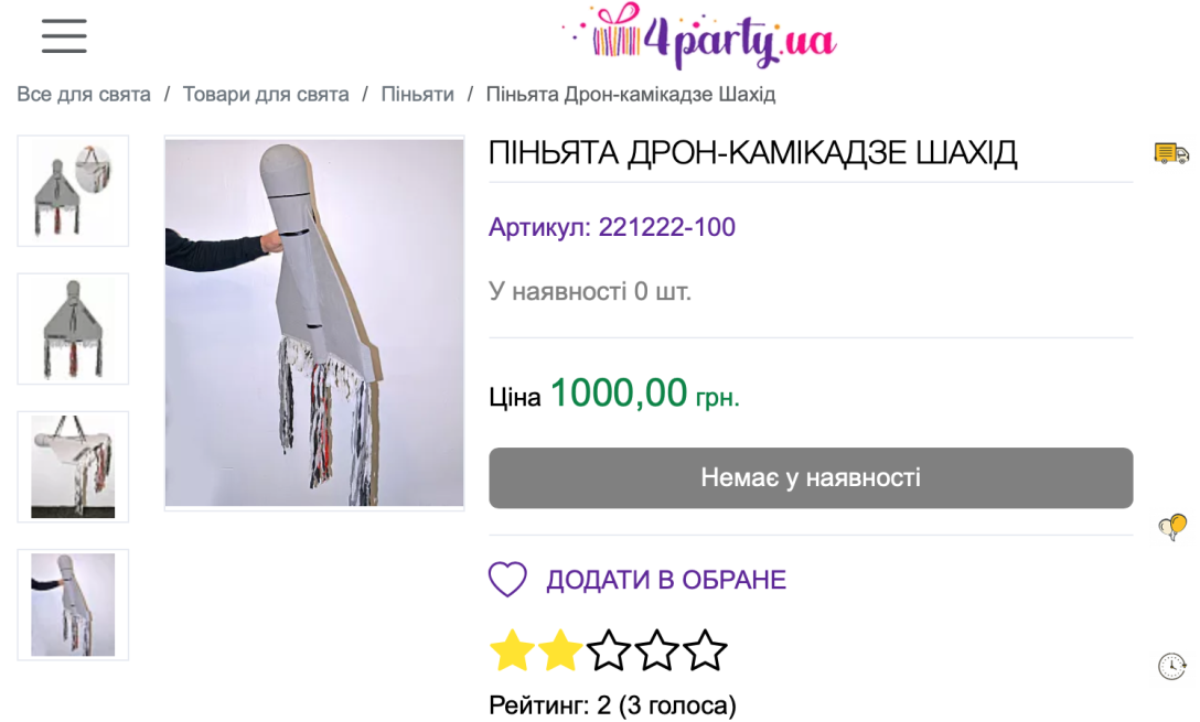 “Піньята ручної роботи у вигляді іранського дрона камікадзе. Зверху є стрічка, за яку вона підвішується. Піньяту у вигляді дрона Shahed-136, можна наповнити різноманітними солодощами або дрібними сюрпризами-сувенірами та із задоволенням збивати і розбивати її, щоб дістати приз. Цей вид гри оцінять як дорослі, так і діти!” — йдеться в описі до товару.