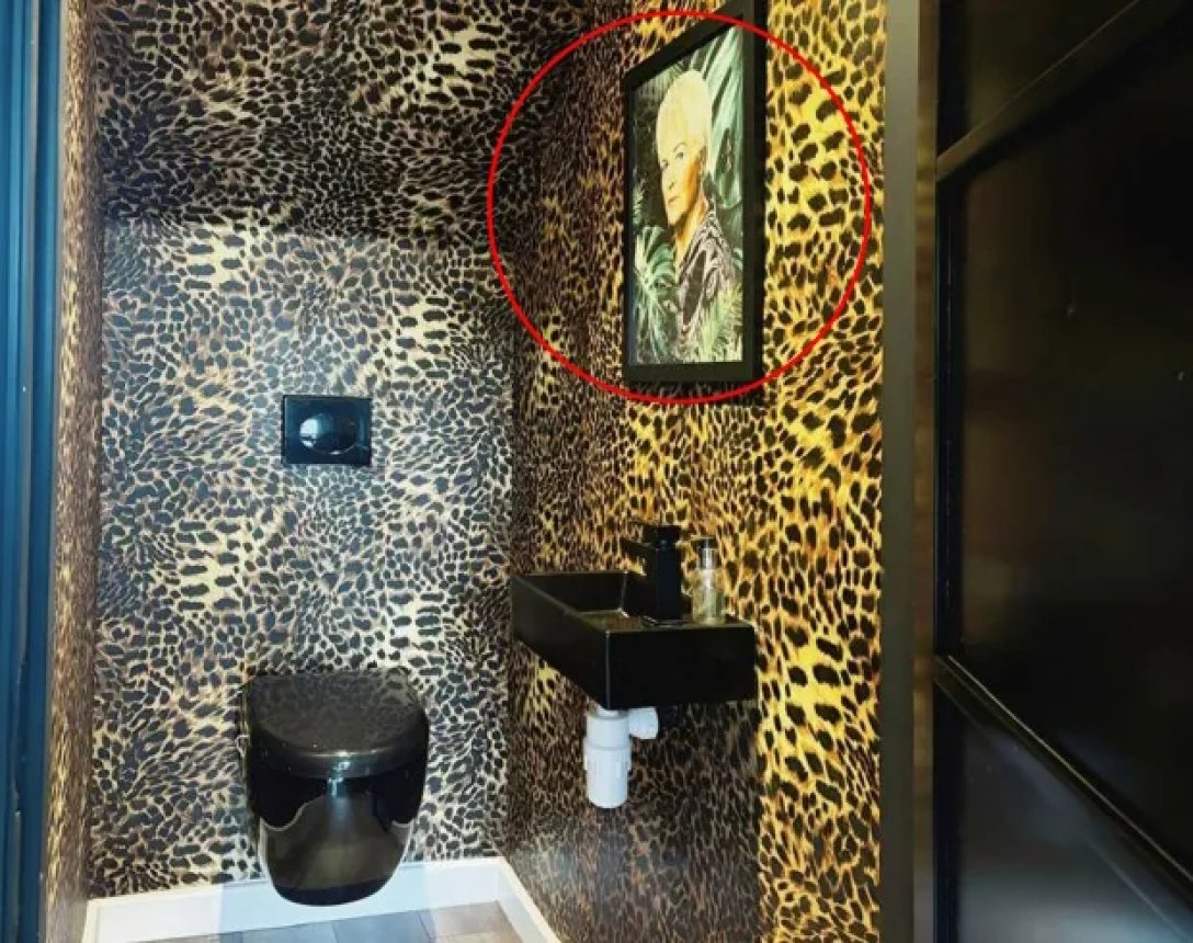 Туалет на першому поверсі обклеєний шпалерами з леопардовим принтом, а над раковиною, замість дзеркала, висить фотографія Пет — персонажа мильної опери BBC “Мешканці Іст-Енду”, яку в період з 1986 до 2012 року грала актриса Пем Сент-Клемент.