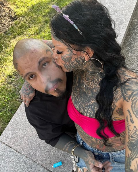 Жінка зізналася, що витратила близько 330 тисяч доларів на татуювання, які покривають 90% її тіла. Її партнер Вампіро також сильно татуйований.