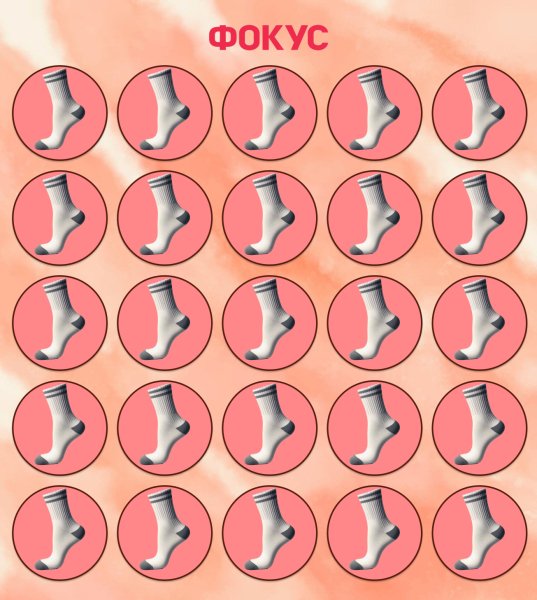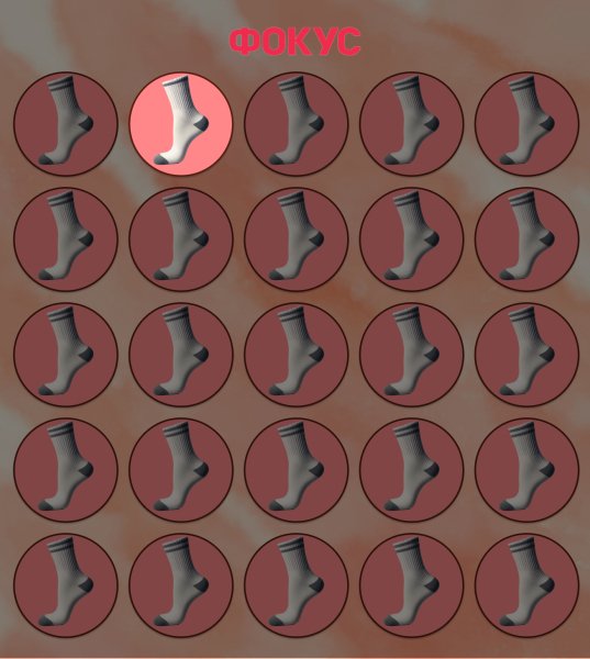 На картинці перед вами зображено безліч шкарпеток, акуратно розміщених у круглих рамках. З першого погляду здається, що всі вони абсолютно ідентичні. Але серед них є один, який відрізняється від інших! Ваше завдання — знайти цю особливу шкарпетку за 20 секунд.