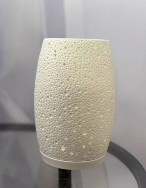 Простий дизайн свічника має оригінальну текстуру з маленькими круглими вентиляційними отворами, які створюють тепле сяйво, коли в ньому запалюють свічку.