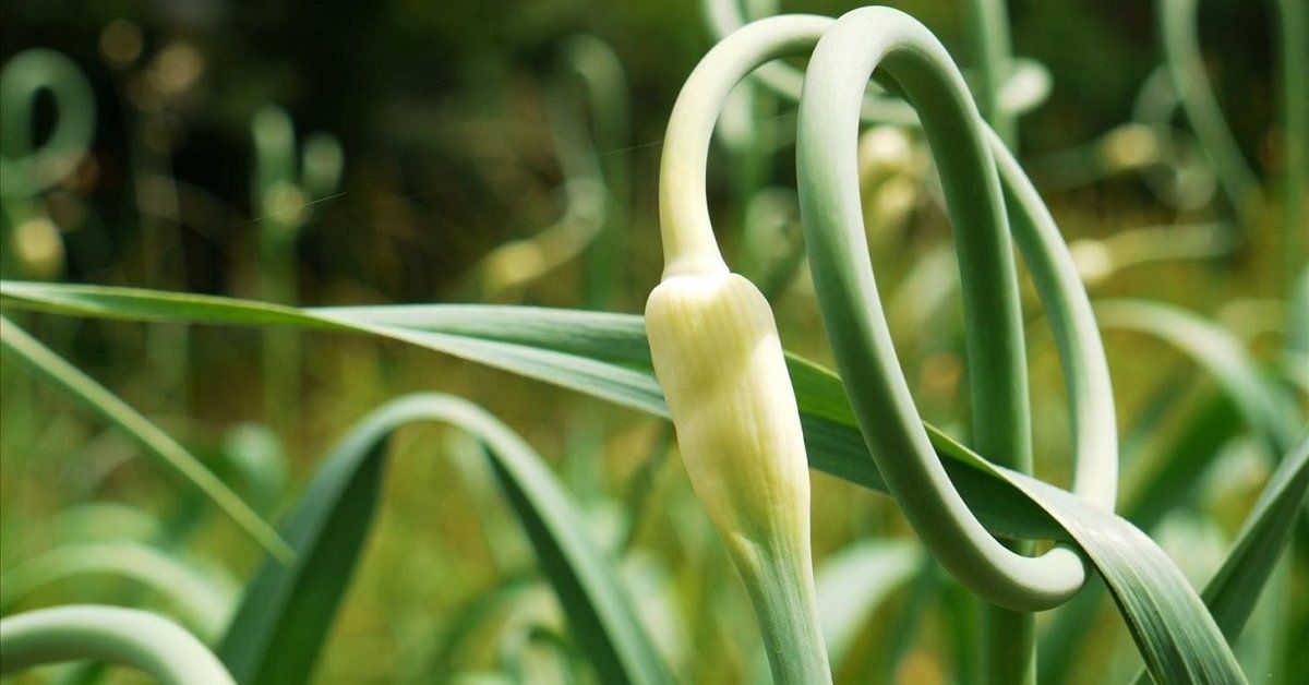 У червні часник випускає стрілки. Їх треба обов’язково зрізати, якщо хочете, щоб голівки часнику були великими. Якщо стрілку не прибрати, вона забиратиме силу у рослини й часник буде дрібним.