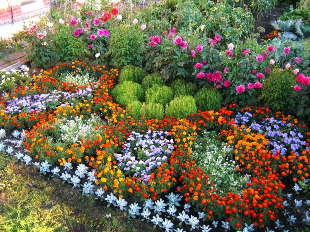 А от всередину можна розглянути кабачки, високу цибулю, томати. По краях висадіть петрушку, суницю, салати. Зверніть увагу, що овочі та квіти повинні рости на одній грядці. Наприклад, поруч з помідорами гарно будуть виглядати чорнобривці.