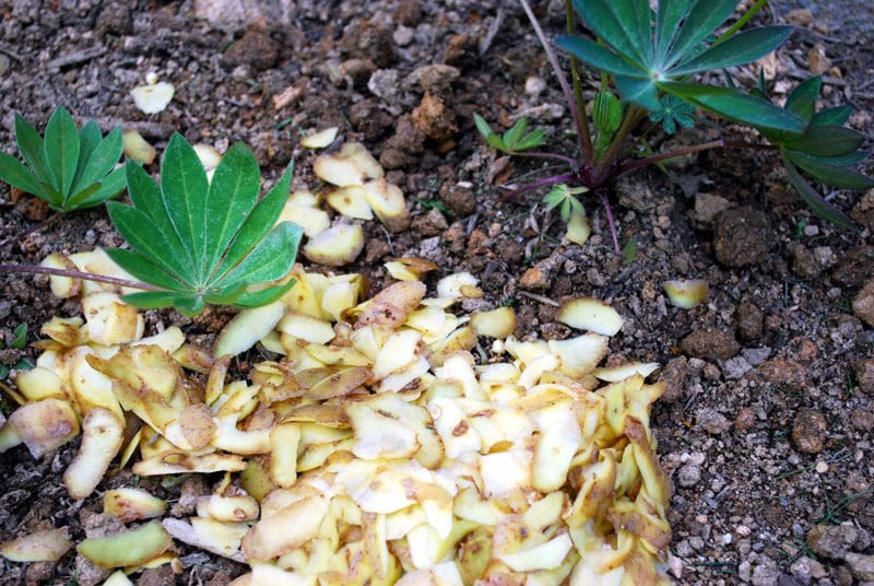 Ще один варіант удобрення лушпайками картоплі – це прикопування. Підійде для підгодівлі дерев та кущів. Треба розкласти лушпайки рівномірно біля стовбура дерева або навколо куща, рясно полити й прикопати ґрунтом.