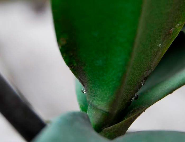 - Полив. Вода також є важливою складовою для нормального зростання орхідеї. Якщо кількість вологи не відповідає потребам рослини, можуть з’явитися липкі краплі на поверхні листя.