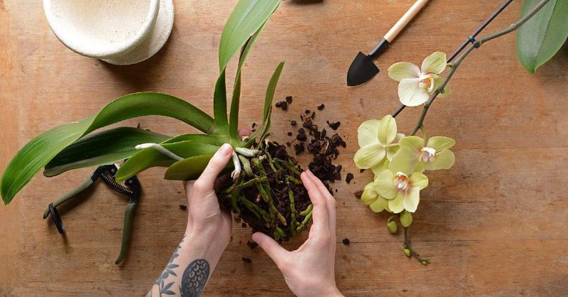 Викладіть у горщик шарами: керамзит, мох сфагнум, який бореться з бактеріями та утримує вологу, соснову кору та ґрунт для орхідей. Коріння покладіть всередину горщика та закріпіть корою сосни, після цього додайте трохи ґрунту, а поверх знову мох та кору. Перед посадкою перевірте коріння, щоб було неушкоджене й не гниле.