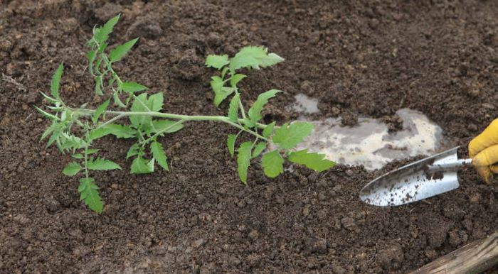 Досвідчені городники радять садити розсаду помідорів у ямку напівлежачи. Так помідор випускає додаткове коріння й швидше приживається. Такий спосіб посадки допоможе прижитися навіть тоненьким перерослим помідорам.