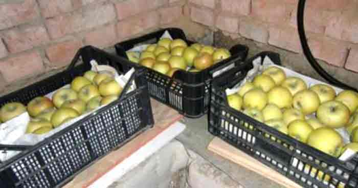 Склавши яблука в ящики – перекладіть кожен шар картоном. Краще їх скласти у 2 ряди, але не більше. Можна також кожне яблуко загорнути в папір. Якщо ви живете не в приватному будинку й немає підвалу, то можна тримати яблука на утепленому балконі.