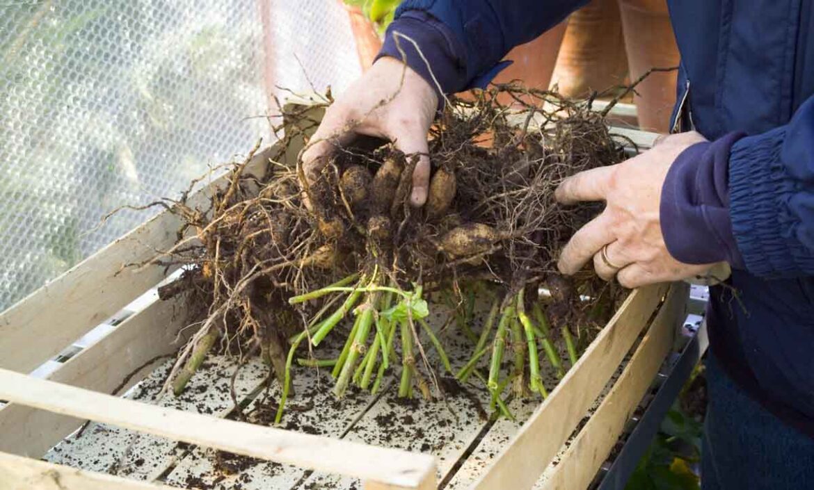 Щоб корені не пересихали, їх можна пересипати в зручних горщиках для зберігання піском, торфом, стружкою або соломою. В окремих випадках бажано обернути кожен пучок бульб папером.