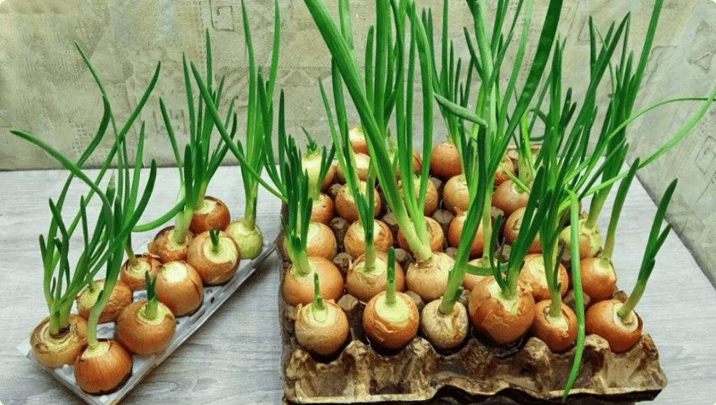 На практиці у господинь добре зарекомендував себе звичайний лоток від яєць. У нього влазить досить багато цибулі, тому зелених соковитих і солодких пір’їн буде багато.