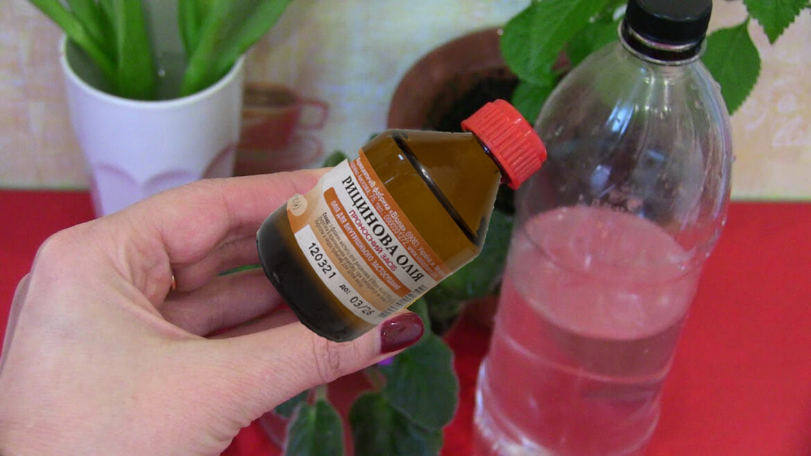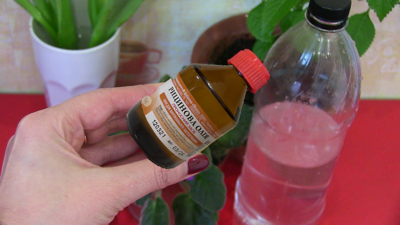 Потрібно приготувати розчин. Для нього беруть 1 л відстояної води кімнатної температури та 1 ч.л. рицинової олії. Суміш треба зробити однорідною. Олія має добре змішатись із водою. Поливати рослини розчином потрібно один раз на місяць.