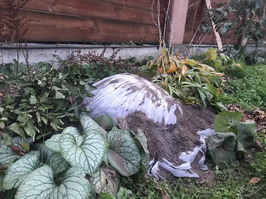 Деякі садівники мульчують гортензію листям. Але цього може бути недостатньо,тому що листя розноситься вітром. Тому поверх листя треба вкрити ще якимсь матеріалом. Це може бути спанбонд, лутрасил, мішковина або плівка.