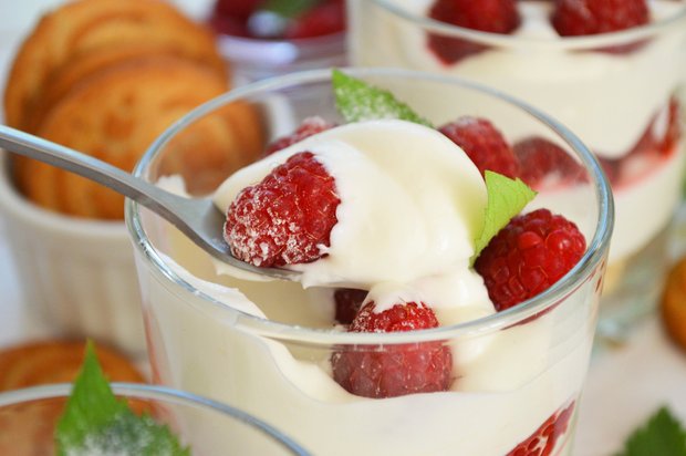 Найперше треба підготувати інгредієнти. Малину промийте, щоб була чиста. Якщо у вас заморожена, дайте трохи розтанути. Печиво покришіть, а вершки збийте із цукровою пудрою. Все максимально просто.