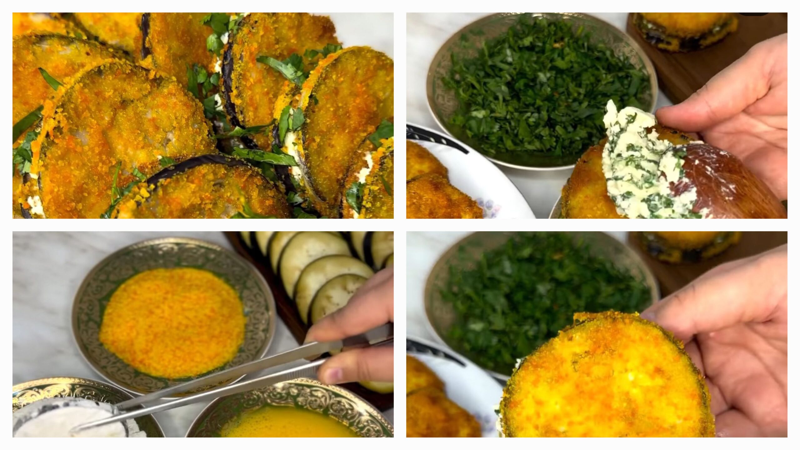 Яйце збийте виделкою та в іншу тарілочку насипте панірувальні сухарі. Потрібно буде баклажани опустити в борошно, потім в яйце та в панірувальні сухарі. Обсмажте до золотистої скоринки з двох сторін.