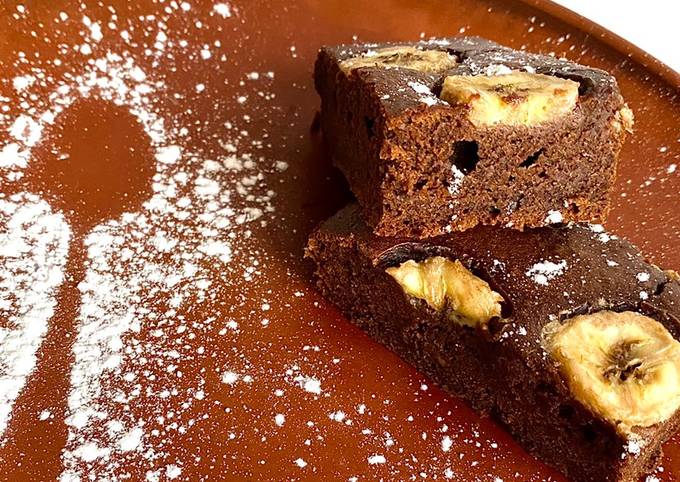 Один банан, яйця, борошно, какао, розпушувач, молоко змішайте разом. Тісто виходить рідке. Другий банан наріжте шматочками та викладіть на дно форми. Залийте тістом.