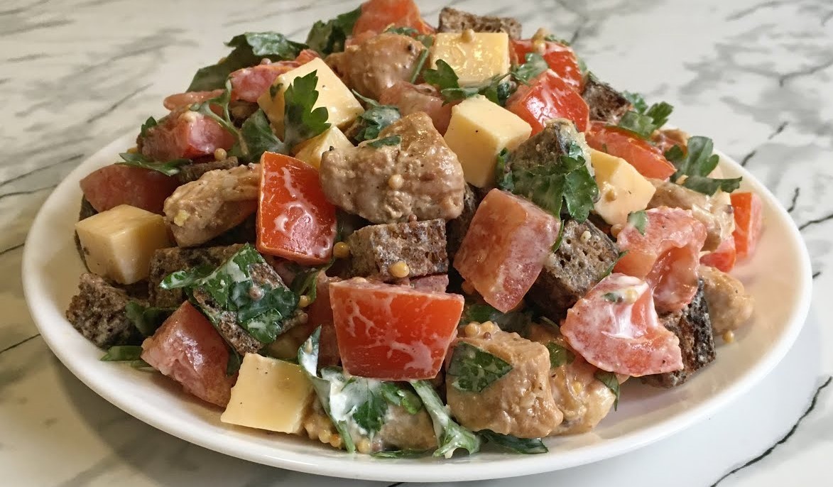 Салат за цим рецептом буде смачним на обід, вечерю чи до святкового столу. Заправляється заправкою без майонезу.
