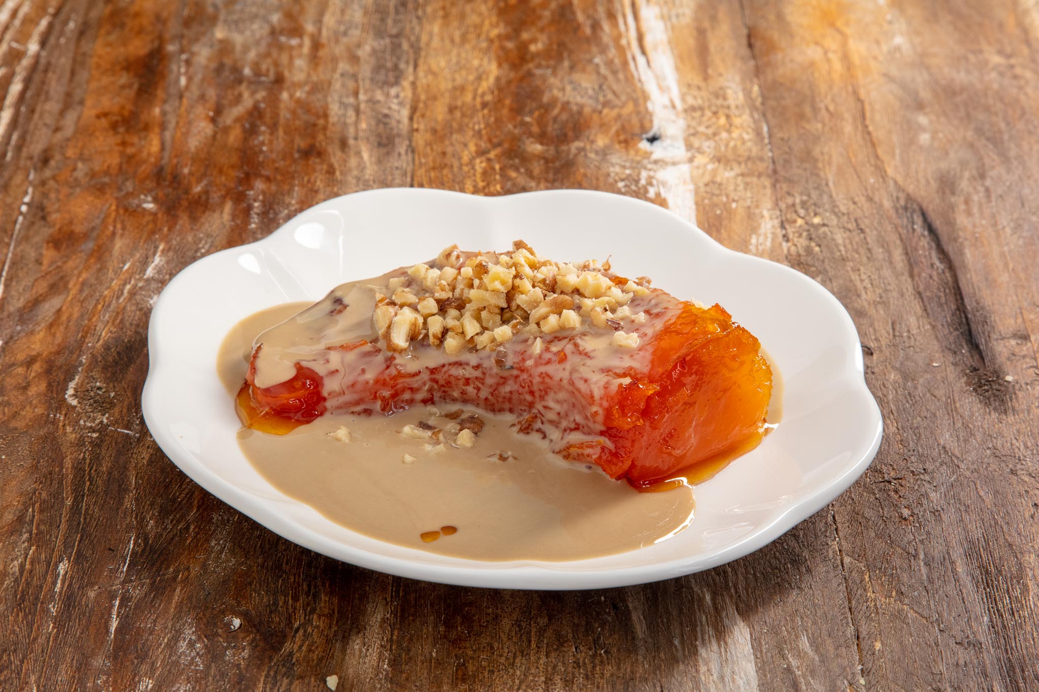 Готові гарбузяні шматочки викладіть на тарілку, посипте подрібненими волоськими горіхами. Ще смачно полити тахіном (кунжутний турецький соус). Як варіант, смачно і з вершками чи сметаною. Смачного!