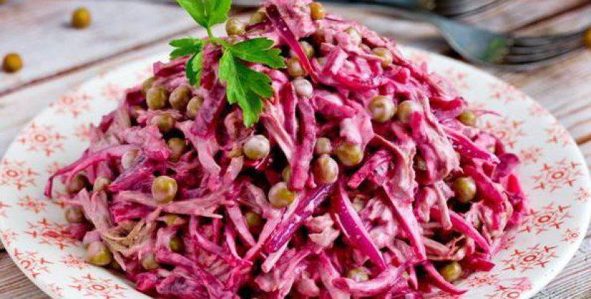Салат з буряком та консервованим горошком не тільки яскраво та апетитно виглядає у тарілці, він ще й дуже смачний!