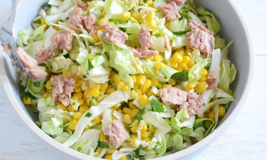 Все готується дуже просто. Капусту нашаткуйте. З тунця злийте рідину, а рибу розімніть виделкою. Яйця мають бути відварені та натерті на тертці. Змішайте всі компоненти разом.