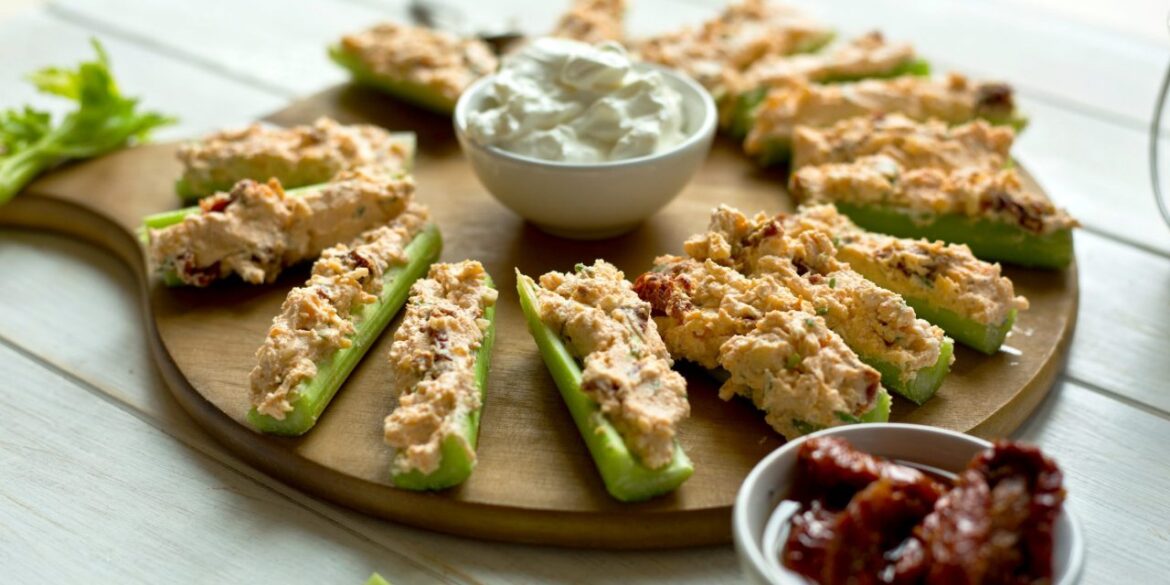 Стебла селери розріжте на 2-3 частини. На кожну з них покладіть намазку. Тарілку прикрасьте салатним листям та викладіть зверху закуски. Смачного!