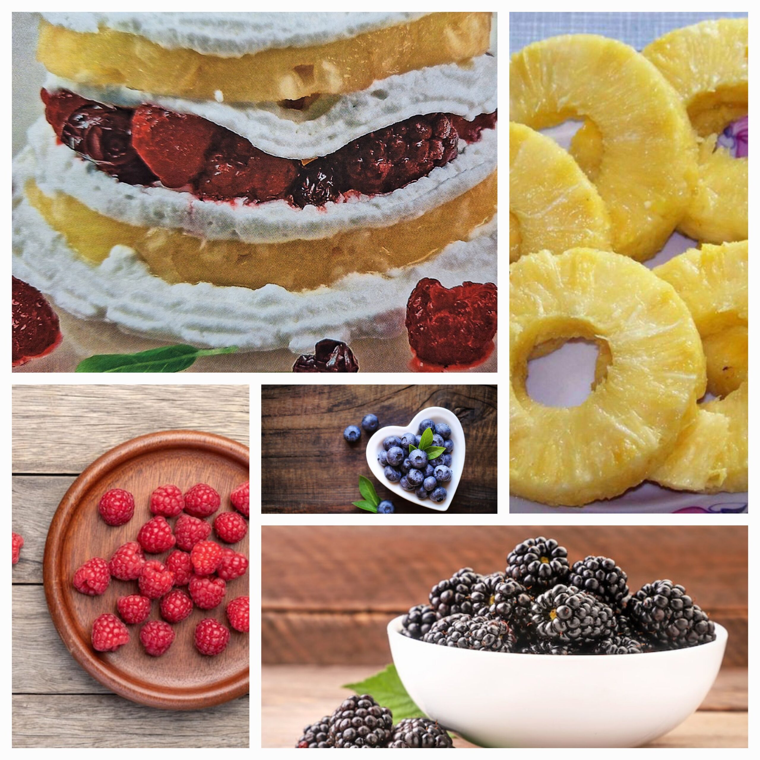 Збийте вершки з цукровою пудрою. Тепер просто сформуйте десерт. Покладіть ложку вершків, на них кружальце ананасу, знову вершки, ягоди і т.д. Вийдуть фруктово-ягідні пірамідки.