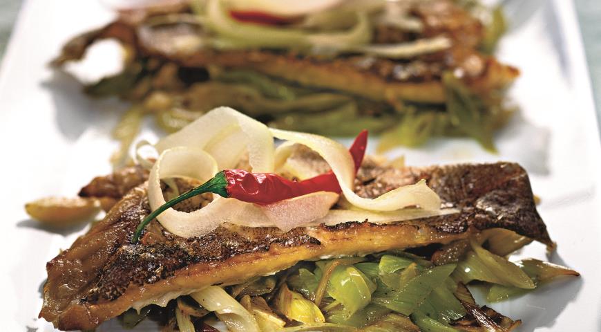Home Рецепти Готуємо на вечерю морського окуня з цибулею-порей