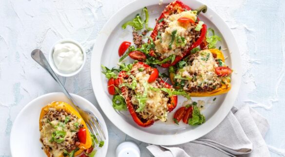 Візьміть болгарські перці та розріжте їх навпіл, вийміть серцевину. Викладіть у форму. В кожну половинку покладіть начинку. А зверху присипте тертим сиром. Випікати таку смакоту треба при температурі 200 градусів протягом 30-40 хвилин. Смачного!