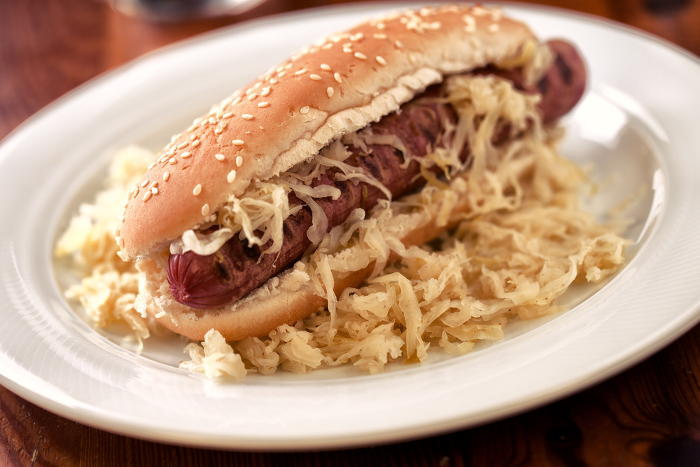 Хот-дог в Німеччині люблять готувати з квашеною капустою та морквою. І вони задають основний смак та доповнюють його. Окрім того, вам потрібна гостра гірчиця та цибуля. Це буде дуже смачно.