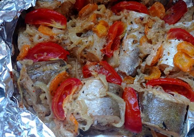 На деко вистеліть пергамент, викладіть овочі, цибулю та рибу. Накрийте пергаментом та поставте в духовку на 35 хвилин при температурі 200 градусів. Смачного!