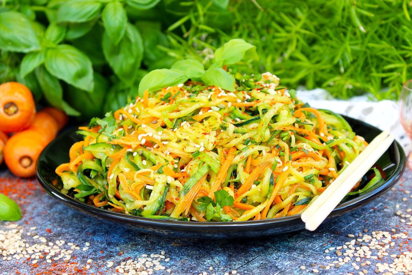 Насамперед підготуйте всі вказані за списком інгредієнти. Кабачки для салату краще використати молоді. У них тонка м’яка шкірка і немає насіння. Моркву візьміть соковиту та солодку. Соєвий соус з рецепту можна виключити та використовувати трохи більше солі. Кількість часнику візьміть на свій смак.