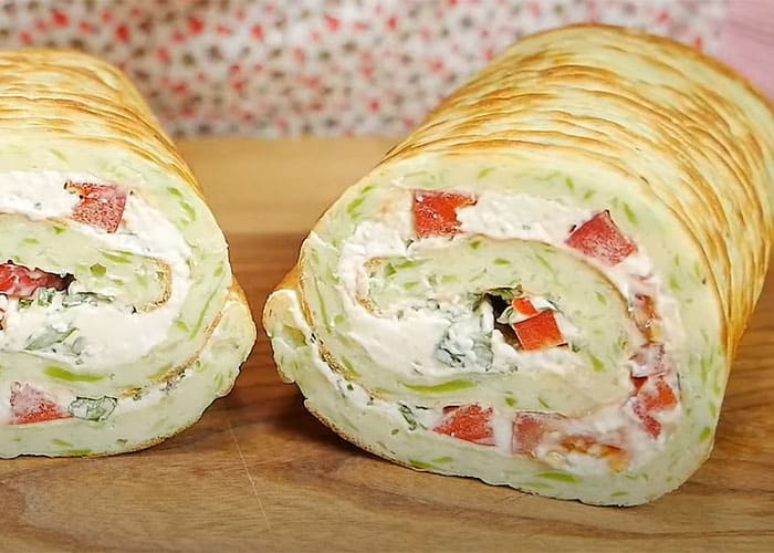 Нанесіть начинку на корж з кабачків. Загорніть в рулет. Та поставте в холодильник для охолодження. Найсмачніше, коли з вечора поставити, а на наступний день їсти. Смачного!