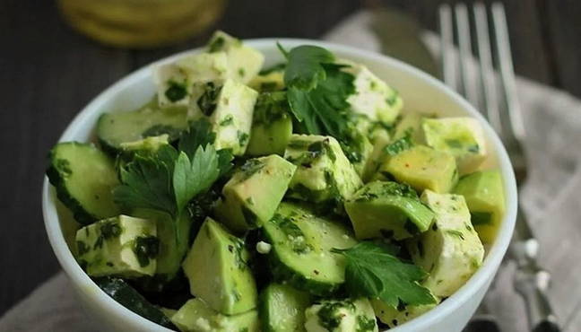 Огірок та авокадо підготуйте. Поріжте биком все, щоб салат був потім гарний. Подрібніть зелень, яка вам подобається. На авокадо треба полити сік лимона або лайма, щоб він не темнів.
