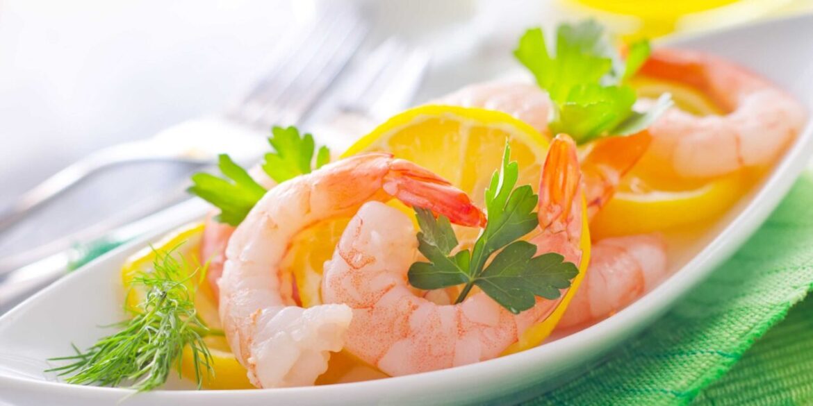 Креветки почистіть та покладіть в киплячу воду на кілька хвилин. Охолодіть їх та з’єднайте з соусом. Полийте трохи лимонним соком.