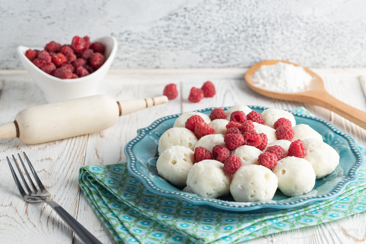 Після цього поділіть його на 4 частини. Сформуйте кожну частину у вигляді ковбаски й наріжте на маленькі шматочки. Зробіть зі шматочків кульки та відваріть у підсоленій воді. Подавайте зі сметаною, ягодами або джемом.