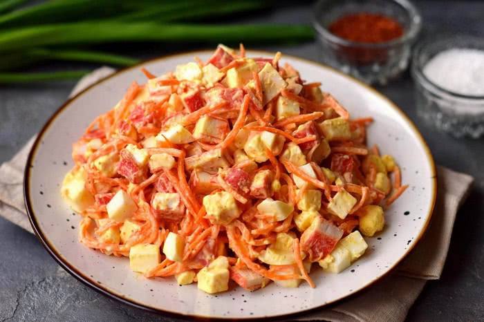 Салат з крабовими паличками та корейською морквою готовий.