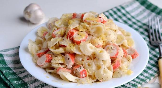 Крабові палички нарізаємо довільними шматочками, а часник подрібнюємо.