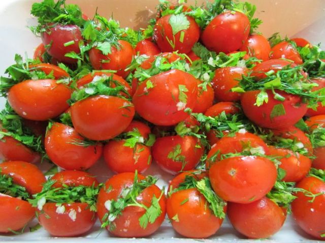 Зелень теж повинна бути гарною вимитою і висушеною. Після цього ми її дрібно шаткуємо, змішуємо з посіченим часником і відправляємо в надрізи в томатах.