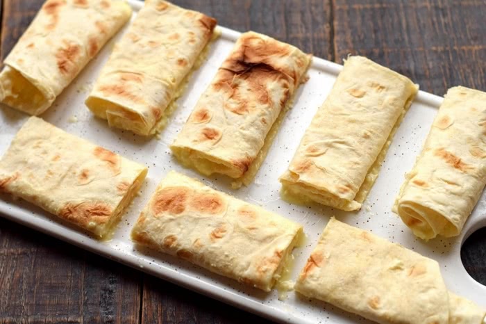 Краще за все брати листи лаваша більшого діаметру. Покладіть начинку. Щоб вона трималась в середині, загорніть лаваші за принципом голубців. І відправляйте підсмажитись на суху сковороду. Сир всередині розплавиться, буде хрустка скоринка та задоволення не заставить себе очікувати. Смачного!