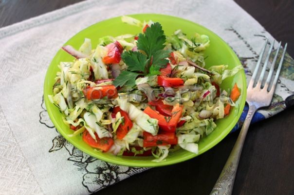 Всі інгредієнти треба помити та почистити. Капусту нашаткуйте, моркву натріть, цибулю дуже дрібно поріжте. Болгарський перець — на смужки. Полийте олією та лимонним соком. За вашим смаком додайте сіль та цукор. Подрібніть зелень. Перемішайте салат. Він готовий. Смачного!