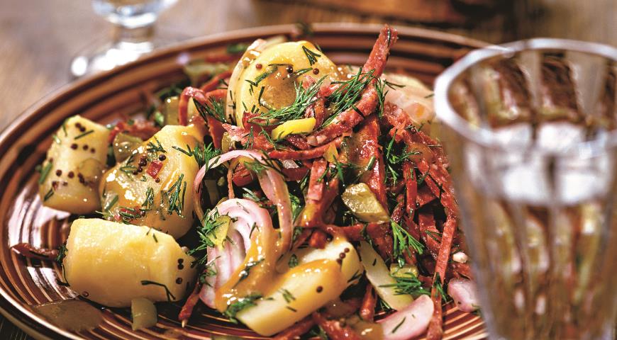Картоплю нарізати соломкою. Ковбасу салямі також. Якщо у вас немає саме такої, візьміть доступну вам. Це може бути рублена ковбаса або відварна. Просто салямі має особливий смак в цьому салаті.